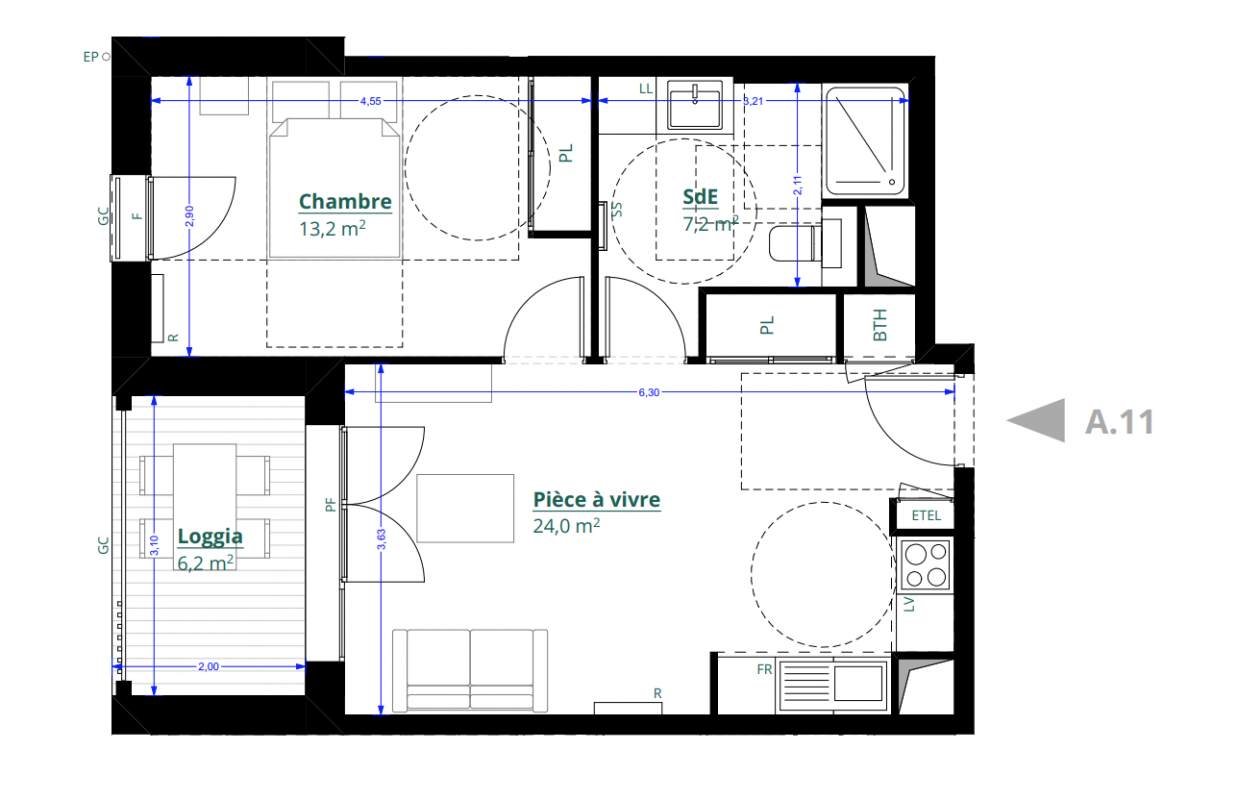 | Voir | Disponible | 219 000€ | A108 | Appt. | T2 | 44.6m2 | 1er | Disponible | 219 000€ | Voir |